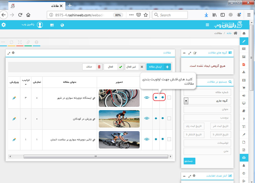 2- در این قسمت میتوانید با کلیک بر روی فلش های بالا و پایین در کنار هر مقاله، مقاله ها را اولویت بندی کنید